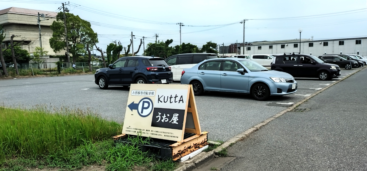 駐車場に停めると店舗に向かう案内板があるので進んでいくとKUTTAがあります。